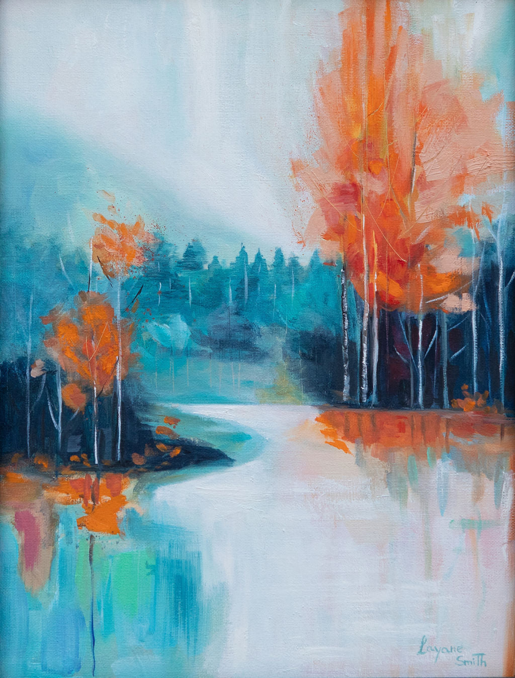 In this abstract portrayal of a lake surrounded by tall, majestic trees, the vibrant hues of fall capture the fleeting beauty of the season. The leaves on the trees reflect the tranquility of nature as it transitions, reminding us of the cycles of life and the divine timing in all things. This painting invites you to pause and embrace the peace and stillness that autumn brings, a reminder of the Creator’s hand in every detail.