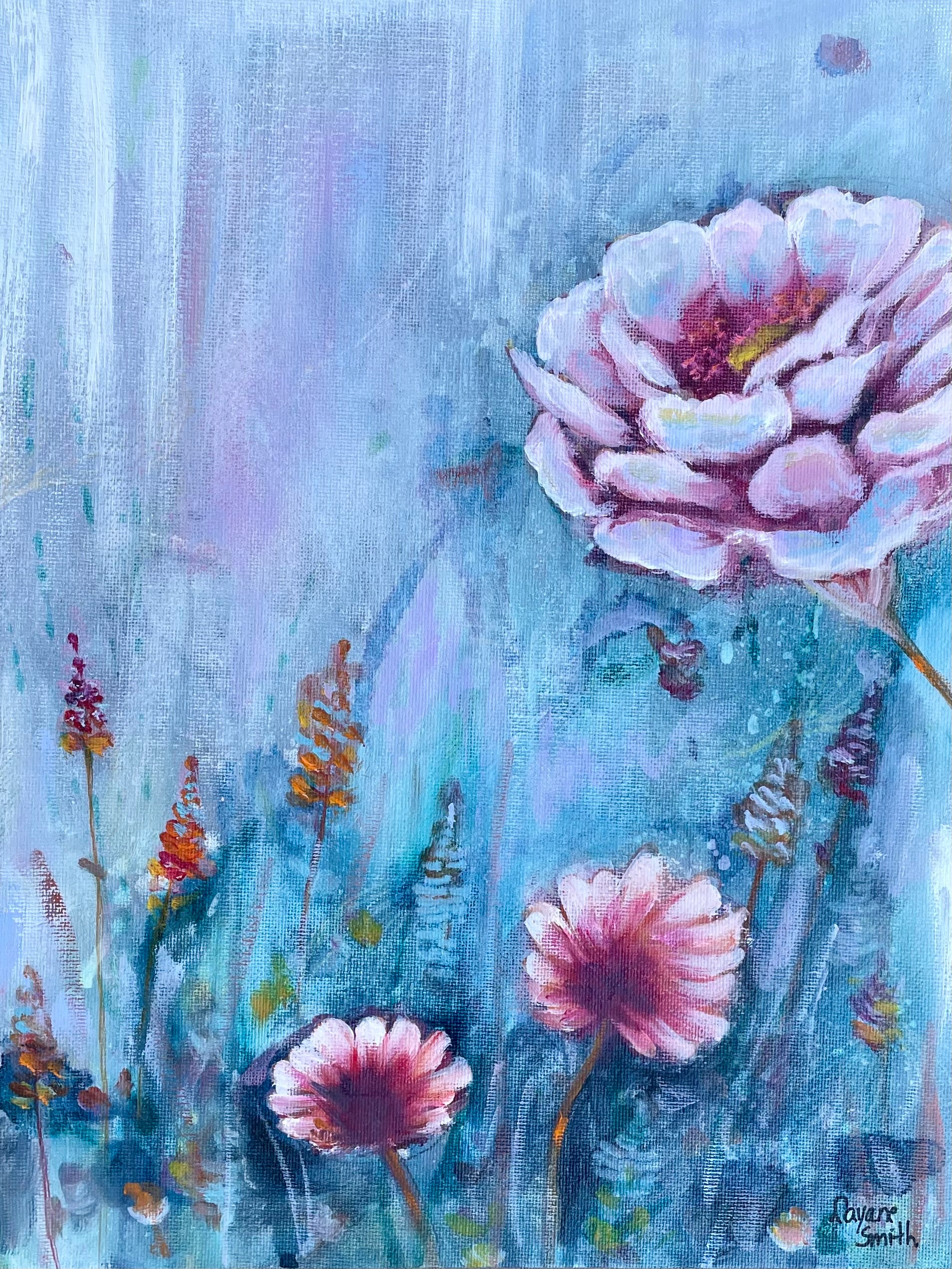 This painting of blooming flowers speaks of growth—both in nature and in the soul. The largest flower stands tall, while two smaller ones thrive beneath it, symbolizing the beauty of guidance, love, and spiritual wisdom passed down through generations. To me, this piece speaks of mentorship, of nurturing, of the way love and wisdom flow through generations. It’s a celebration of spiritual growth, of learning from those before us, and of passing that love forward.