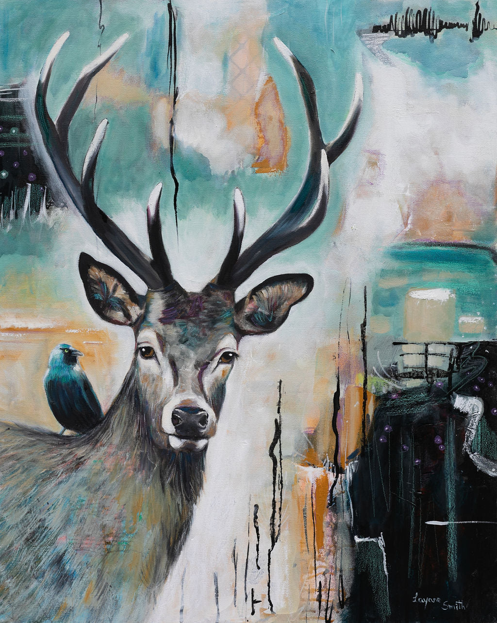 We are supposed to live a harmonic life . When you look at this painting , I hope you can feel a sense of peace and harmony. The deer looking right at you reminds you to use your intuition and compassion towards you and others, to shine your light so others may find their way home .The deer also represents regeneration . The little bird sitting on the deer is a common grackle . This bird actually represents courage , resourcefullness, and boldness. We need to be bold to be who we really are , we need to use our intuition, and we need to be kind to others and ourselves. This is a good way to attain harmony in life.