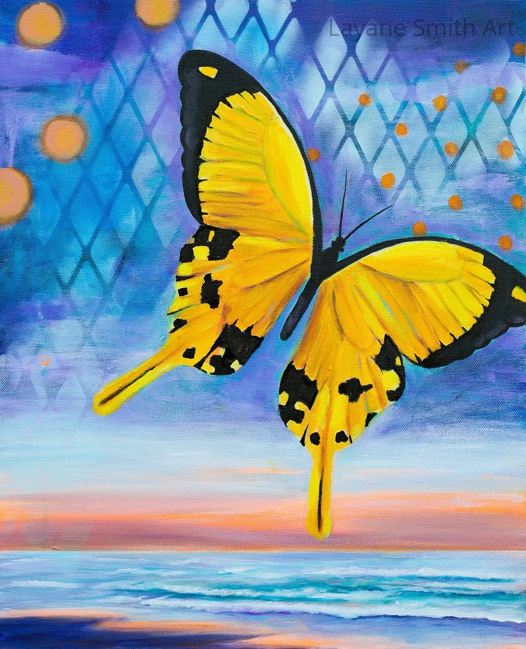 Inspired on a moment of serendipity and an unexpected encounter with butterflies at a beautiful beach. Abundance and beauty are everywhere! We have to train our eyes to seek for those , and more will follow. The little orange circles are a representation of the abundance around us .The color orange represents optimism and positivity, a perfect color to carry those little bits of sunrise all around .